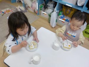 歌に合わせて、乗り物が書いてあるビスケットをポケットから出すと「パトカー!!」と知っている乗り物を言葉にする姿もありました。