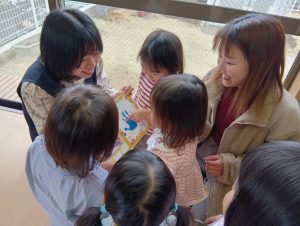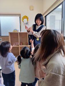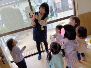 動物のお尻の絵が描いてあるペープサートを見せると興味津々で食い入るように見ていました。また。「ちょーだい!」と手を伸ばす子もいました。