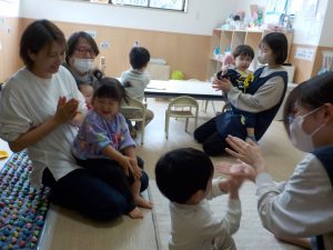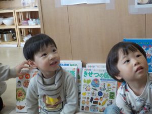 カレンダーを確認しながら、「今日は○○ちゃんのお誕生日おめでとうしようね」と保育者が伝えると、誕生日の歌を口ずさんだり、「○○ちゃん来るかな」と楽しみにする姿が見られ期待を持って参加しています。