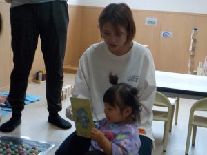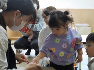 誕生カードを受け取る際には、遊んでいる様子の写真に興味を持ち、「あ!○○ちゃん!」と指差しをしながら保護者の方と「(赤ちゃん人形)お世話してるね」とやりとりしていました。