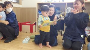3月生まれのお友達の名前をあげて「たんたん♪」とたんじょうびの歌を口ずさむと満面の笑みを見せています。
