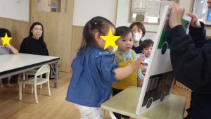 出し物は、”いろいろバス”の大型絵本。「あか~!」「トマト!」と、知っている色や物をみつけると