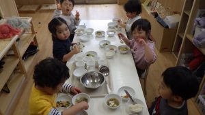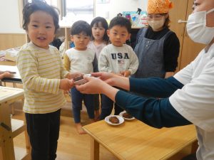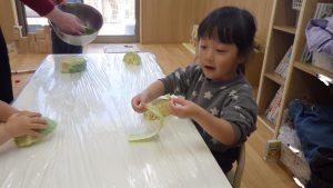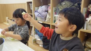 自分でおにぎりを握ってみる、キャベツ千切り、しいたけ洗い等いろいろな食育活動を楽しみにし、