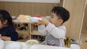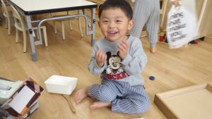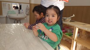 小麦粉、片栗粉、春雨、石鹸、絵の具など様々な感触遊びも取り入れていきました。