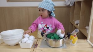 包丁で切る、卵を割る、フライパンを振って炒める・・等しており、普段のお父さんお母さんの姿をよくみているのだろうな、と