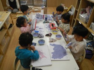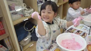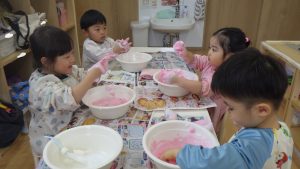 小麦粉、片栗粉、春雨、石鹸、絵の具など様々な感触遊びも取り入れていきました。