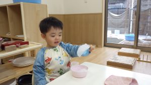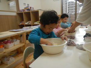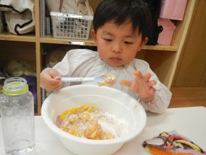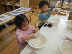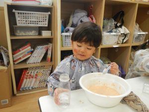 始めは粉だけで触り、水を足していってどう変わっていくのか・・や、色を混ぜてみる等観察していました。
