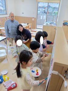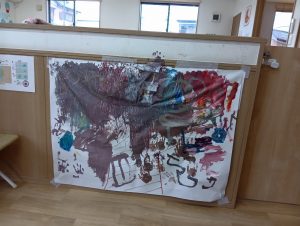 暡造玙に描いおある朚を芋お、絵の具で自由に色を塗り朚や葉っぱを描いおいたした。筆だけじゃなく、手に塗っお描いたり感觊を確かめおいたしたよ。お友達同士で『ここはこうかなぁ』ず考えながら工倫しおいく姿も芋られたした。
