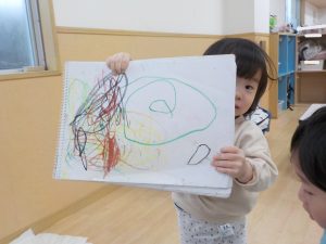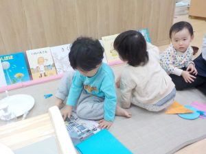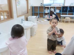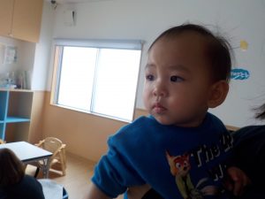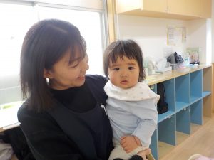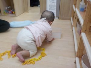 初めて保護者の方と離れ不安な様子も見られていますが、保育者とのスキンシップ等で少しずつ受け入れ、周囲に興味を示して遊んだり探索する姿が見られています。保育者との関わりに、心地良さや安心感が感じられるよう、関わりを積み重ねて行きたいと思っています。