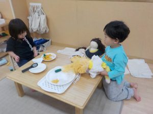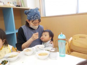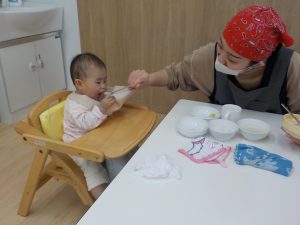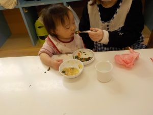 又、保育者の膝の上で安心感を感じながら食べる子もいました。
