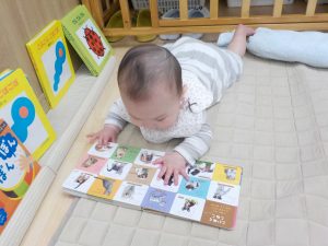 近くにある玩具に興味を示して、手をのばし舐めて確かめたり、保育者と目が合うと微笑んでいますよ。