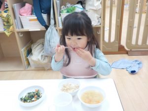 保育園で初めての1口目はおそるおそる口を開け、美味しいと感じると大きな口を開けてよく食べていましたよ。