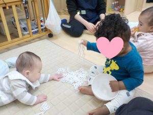 初めて保護者の方と離れ不安な様子も見られていますが、保育者とのスキンシップ等で少しずつ受け入れ、周囲に興味を示して遊んだり探索する姿が見られています。保育者との関わりに、心地良さや安心感が感じられるよう、関わりを積み重ねて行きたいと思っています。