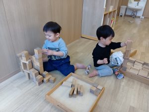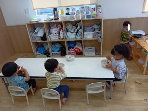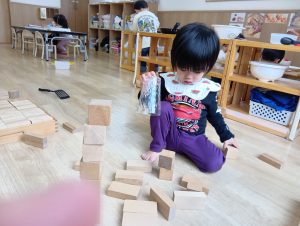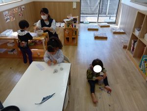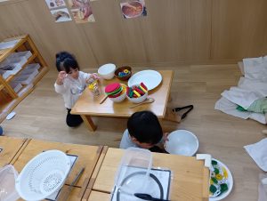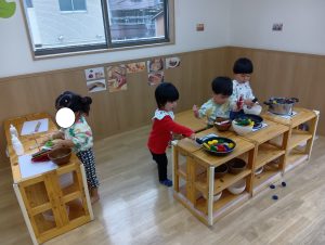 新しい環境にも少しずつ慣れ自ら探索したり、他児や保育者の遊びに興味を示し遊ぶ姿が見られます。おままごとでは、道具を使って自らイメージした事を自由に表現して、楽しむ姿も見られます。また、そこから遊びを自ら発展し、生活の中で見たお店屋さんなどを表現し、遊びの中に取り入れていました。