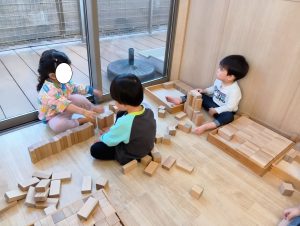積木では自分のイメージした事を自由に表現し、安心するスペースで遊んでいますよ。