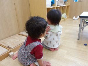 進級したお友だちは、環境の変化を感じ少し不安そうな表情を浮かべる姿も見られていますが、身近な大人の存在を確かめながら、安心できると新しいお部屋の中を探索し、気になった玩具で遊ぶ姿が見られています。