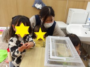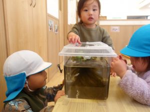 自分の新しいクレヨンでお絵描きをしたり、メダカを観察したり、おままごとコーナーのエプロンを身に着けてお料理したり・・・。やってみたい気持ちを保育者に伝えたり、夢中で遊ぶ中でさらに探索意欲が大きくなっていくよう環境を整えています。安全基地を基盤に新しい保育者とも関わりを広げている姿も見られていますよ。