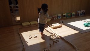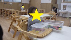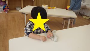 そら組では、つき組の時から「次そら組さんだね」「お姉さんになるの」と進級することへの期待に胸を膨らませていた子ども達。いざお部屋に入ると少し緊張もありながらも長方形の積み木や手の届く場所にある粘土などに興味を持ち自ら手を伸ばし遊び始めていました。