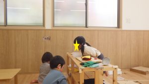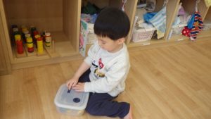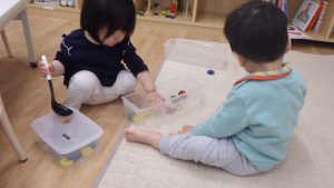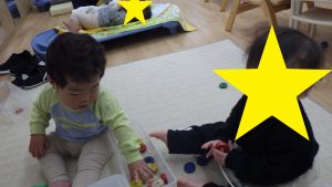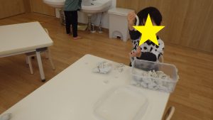 プラステンを見つけると「あ」と見つけた事を教えてくれたり、ポットン遊びのケースに入れると”はいったよ”と保育者の目を見つめ教えてくれる姿もあり、「入ったね」と言葉にしながら受け止めていくともう一度繰り返す姿がありました。受け止められる心地よさを感じられるようやり取りを行っていきたいと思います。