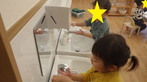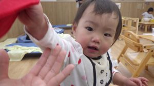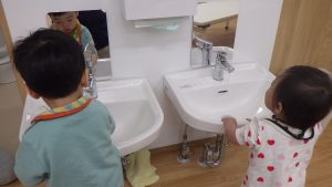 つき組もそら組も手の届く場所にある水道にも興味をもち自分で水を出し触れてみたり、流れる水をじっと見つめたりする姿があります。一緒に触れて「水冷たいね」と声を掛けると「ん」と言ったり、手を叩いて水しぶきを浴び水の感触を感じていました。このような姿から水道付近が水びだしになったり、服が濡れたりすることもあります。その際に大人は子どもに対して水が出ないようにしたり、止めてしまったりするのではなく、子どもの発達は満たされることで次のステップへと進むため、水に十分触れてみることは必要な経験であると考えて関わっています。