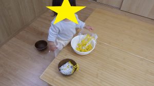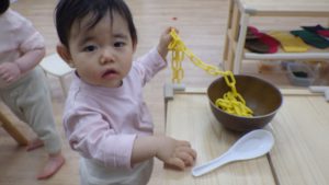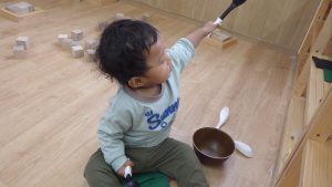 ままごとコーナーにあるフェルトやチェーンリングを持って混ぜてみたり、”どうぞ”と保育者に渡したりしてくれる姿もあります。