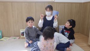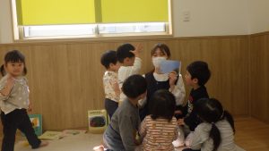 そら組から朝の会を取り入れています。朝の会では、子ども達がその日一日何をするのか見通しを持って過ごせるようにやりとりをしたりしています。やり取りや季節のことなどについて話をしたりすることで子どもたちの興味や疑問が深まったり、自分の気持ちを伝えたり、社会性を育む場となるよう関わっています。子ども達が興味のある話を行うことで子ども達自身が気になり集まって来るような朝の会にしたいと考えています。写真を使用しながら子ども達に一日の流れを伝えることで子ども達も写真や保育者の話に興味を持ち自然と周りに集まる姿がありました。また、子ども達からも「雨だからお部屋だね」「新しいお友達いるね」と自分の感じたことや気付いたことを言葉で伝えてくれる姿も見られるようになってきました。引き続き子ども達の興味に合わせ朝の会を進めていき、子ども達が一日に見通しを持ち安心して過ごせる環境を整えていきたいと思います。