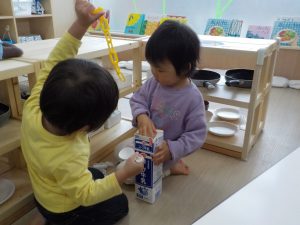 最初は新しいお部屋や保育者に戸惑う様子が見られましたが、だんだんと好きな遊びを見つけて過ごす時間が増えてきています。