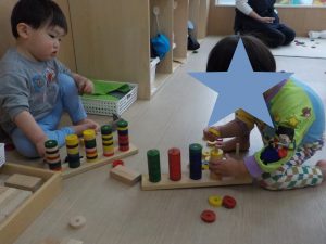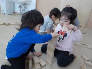 最初は新しいお部屋や保育者に戸惑う様子が見られましたが、だんだんと好きな遊びを見つけて過ごす時間が増えてきています。