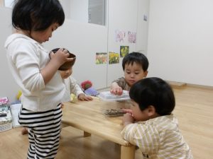 朝登園すると先日連れて帰ったダンゴムシを思い出し「ダンゴムシ見せて」と保育者に伝えます。「あれ?どこだ?あ、いたいた」とダンゴムシの動きをじっくり観察します。「図鑑にものっているかな」と保育者が呟くと、「これだ!」と色んな種類の図鑑の中から昆虫図鑑を持ってきた子どもがいました。一緒に見ながら「これはワラジムシだよ」とその違いを知っている子ども。「〇〇ちゃん、ワラジムシ知っているんだね」と子どもの気付きに感心したり、「ダンゴムシって野菜や果物も食べるんだってね」と新しい発見を共有したり。お迎えの時間「ママにも見せて!〇〇ちゃんも触ってごらん」とお母さんから誘いを受けた子どもが初めてちょんと触れることができたり。子どもと大人が一緒になってその生き物の特性に驚いたり慣れ親しんだりしています。