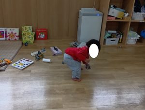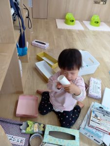 廃材では中に物を入れる・破く事を楽しんでいます。また、クレヨンではなぐり書きを楽しみ、身近にいる保育者に喃語で描いた事を伝えてくれる姿も見られます。