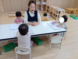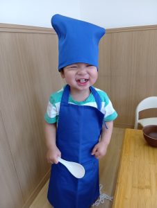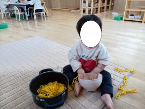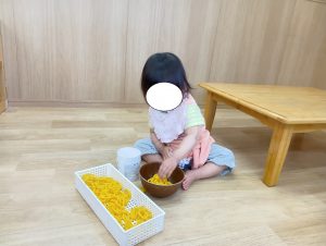 おままごとでは、保育者が道具を使って遊ぶ事で物の使い方を獲得し、興味を示した子どもたちは触れてみたり、道具を使って遊んでいます。『んまんま』と言葉にしたり、保育者が『美味しいね・冷たいね・温かいね』と、代弁する事で五感の育みに繋がっていきます。