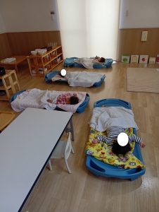 進級してお布団から睡眠用のコットになりました。安心する保育者が身近にいる事で心地良さを感じ、質の良い睡眠に繋がっていきます。