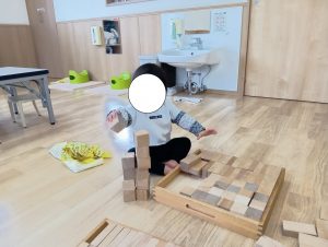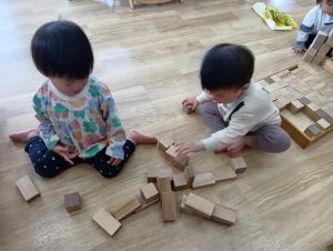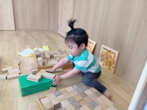 ニ種類の積木を使って自分のイメージした事を遊びの中で表現しています。ただ積むだけではなく、子どもたちがどうやって積んでいこうか、遊びの中で試行錯誤を重ねています。