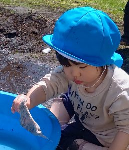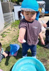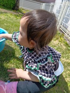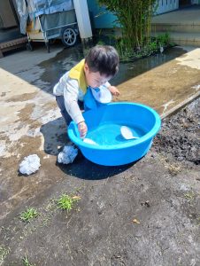 園庭に出ると、タライを自分で持って、『水を入れてほしい』と伝えてくれます。