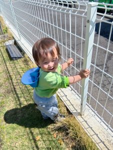 咲いているタンポポ等の花や葉っぱに気づくと、不思議そうに触ってみたり、指しながら「お!あ!」と保育者に教えてくれる姿もありますよ!