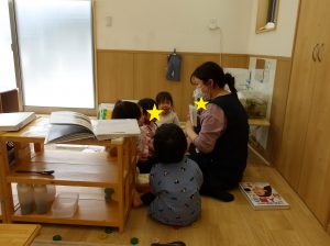 子ども達が1日を安心して過ごせるよう、登園後おやつを済ませた子ども達一人ひとりと改めて顔を合わせ、「おはようございます」と挨拶をしたり、お名前を呼んでお友だちの存在を確認したりしています。自分の名前を呼んでもらうと嬉しそうな表情、少し照れている表情など様々です。「はーい」とお返事が返ってこなくても大丈夫です。表情や少しの動きからしっかり子ども達の気持ちは伝わっています。アイコンタクトで受け止め「元気に来たね」とやり取りしています。そんなやり取りをしているといつの間にか保育者の周りには子ども達が自然と集まっていました。遠くから耳だけを傾けて興味を示している子もいますよ。