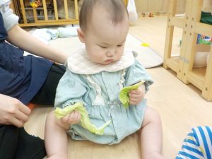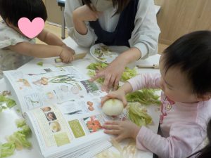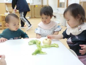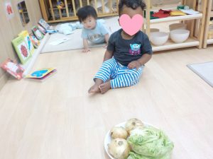 保育者が持ってきた野菜が目に入ると興味津々に近づいて手をのばしていました。