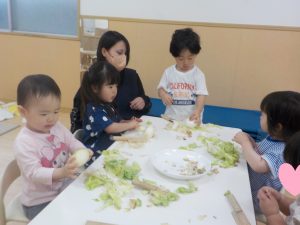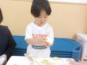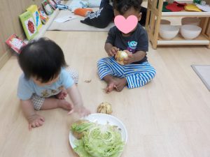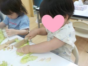 上手く切れず…「たまねぎは皮が剥けるよ」「キャベツは1枚1枚剥せるよ」とやりとりをすると手で剥いたりちぎり始めました。