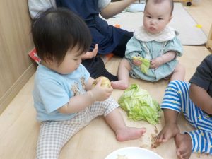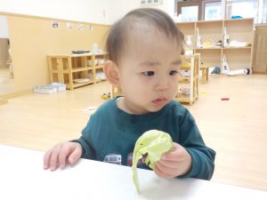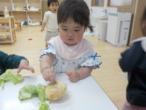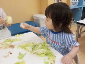 手に持ってじっと見るところから始まり、次第にキャベツや玉ねぎの皮を引っ張り、ちぎれることを気づく姿もありましたよ。