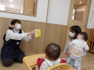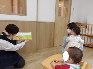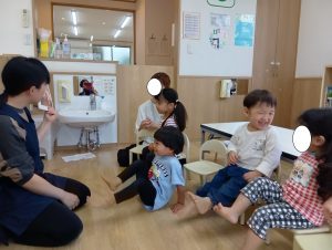 つき組ではY君、Sちゃんのお誕生日です。いつもと違う環境に少し不安を感じていましたが、保育者がお誕生日会で、読む絵本を見せると興味を示すお友達。お誕生日の歌では、拍手をしたり笑い合う姿も見られました。