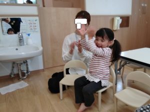 出し物は動物・車が出てくるクイズです。小さな穴から動物や車が出てくると『キリン!!』『ニャーニャートラック!』など言葉にし、クイズに正解すると『やったー!』と拍手をしたり、ジャンプをして嬉しさを表現していました。