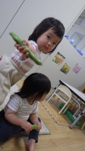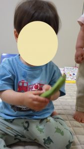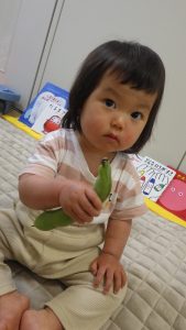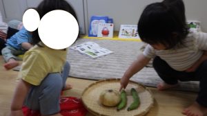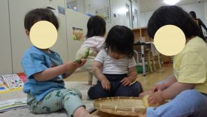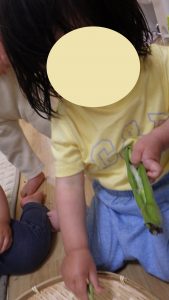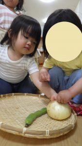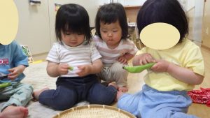 1歳児クラスの子ども達は、ざるの上の新玉ねぎとそらまめを見てもすぐには触りませんでした。玉ねぎを食べたことがあっても調理する前の状態を見るのは初めてかもしれませんね。指先でつんつんしてみたり、指先でかりかり薄皮をめくってみたり。そらまめの方は得体の知れない何か…としてドキドキしているようでした。保育者がそらまめを手に取り、莢を割ってみるとその中に小さな豆が入っているとわかり興味を持ち始める子ども達。「触りたい」「やりたい」と意欲が湧き、保育者と同じように剥き始めました。莢の内側の細かい毛の触り心地は他では味わえない感じですね。綿のようにふわふわ。豆をじっくり観察したり匂いを嗅いでみたり、口に入れたくなってみたり。お友だちが触っている姿を見て安心して触る子どももいました。